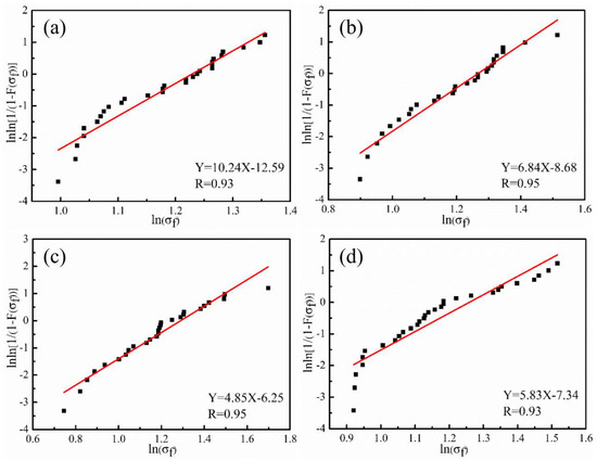Weibull distribution curves of tensile strength for CF monofilaments under different plasma treatments: (a) untreated CF, (b) CF–AA15, (c) CF–AA1, and (d) CF–AA5.