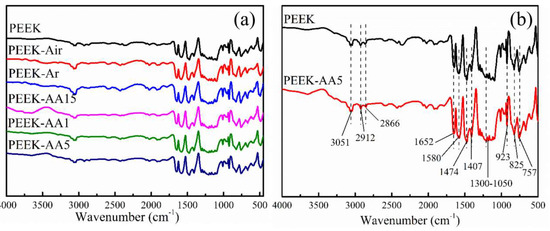 We used FTIR spectroscopy to investigate PEEK fibers before and after plasma treatment. The wide spectra from 4000 to 500 cm−1 for PEEK and different plasma-treated PEEK are shown in Figure 8a. In addition, PEEK and PEEK–AA5 with peak positions [32,33,34] are separately compared for detailed analyses in Figure 8b, with peak assignments provided in Table 3. Wavenumber values are shown for both spectra, and they were identified by reference to the absorbance bands shown in Table 3. FTIR measurements showed subtle distinctions between PEEK fibers under specific plasma conditions, even though significant peak data were presented. This could possibly be attributed to the technique’s 1–2 μm testing depth. Furthermore, the low sensitivity of FTIR impedes its application for determining trace components. As reported by the producer, the rate of surface etching is 20 nm/min at “Hi” for this plasma treatment equipment. In our test, the maximum treatment time was 10 min, and thus the etching depth was ~200 nm, which is far from the testing depth of 1–2 μm. This was still regarded as an effective result as it suggests that plasma treatment is aimed at surface modification, and the effects are therefore exclusively surface effects.