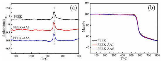 Differential scanning calorimetry (DSC) and thermogravimetric analysis (TGA) curves for PEEK fibers and plasma-treated PEEK fibers: (a) DSC curve and (b) TGA curve.