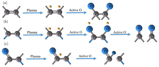 Possible mechanism of surface group oxidation by plasma treatment: (a) generation of C–O bonds, (b) generation of C=O bonds, (c) generation of O–C=O bonds.