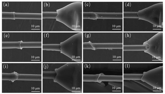 SEM images of samples after microdroplet test. (a) The beginning of CF/PEEK, (b) the ending of CF/PEEK, (c) the beginning of CF/PEEK–Air, (d) the ending of CF/PEEK–Air, (e) the beginning of CF/PEEK–Ar, (f) the ending of CF/PEEK–Ar, (g) the beginning of CF/PEEK–AA15, (h) the ending of CF/PEEK–AA15, (i) the beginning of CF/PEEK–AA1, (j) the ending of CF/PEEK–AA1, (k) the beginning of CF/PEEK–AA5, (l) the ending of CF/PEEK–AA5.