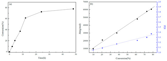 Effect of reaction time on conversion rate (a) and effect of conversion on Mn and PDI (b).