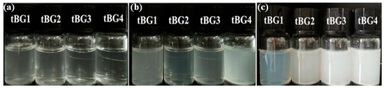 The LCST of copolymers were with a UV–Vis spectroscopy. As shown in Figure 4a, the transmittance from tBG1 to tBG4 was gradually increased at room temperature, which was because the amount of the characteristic functional group Cl was increased, in other words, the density of the hydrophilic copolymer P(MEO2MA-co-OEGMA) segment gradually increases from the tBG1 to tBG4. In addition, as can be seen from the figure, the transmittance of the four copolymer aqueous solutions began to decrease sharply after 35 °C, indicating that the LCST of the tBGs solutions was ~35 °C. Beyond 40 °C, the transmittance of tBG1 became steady, but the others solutions’ transmittance was 0%, this illustrated that the content of MEO2MA and OEGMA was one of the important factor that affect the temperature sensitivity of the copolymer solutions at the same concentration.