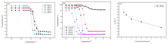 Figure 4b is a graph showing the effect of temperature on tBG4 solutions transmittance with different concentration, and Figure 4c is the LCST curve of the tBG4 solutions with different concentration. Combining the two graphs, it can be seen that the LCST of the tBG4 copolymer solutions gradually decreases as the concentration increases from 0.50 to 8.00 mg/mL. This indicated that solution concentration was also an important influence factor when studying copolymer solutions; a similar conclusion has been reported before [37].