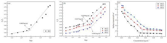 Determination of critical micelle concentration (CMC): (1) Surface tension is one of the methods to determine the critical micelle concentration value of the copolymers. This experiment measured the surface tension of the copolymer solutions with the surface tension meter (DCAT21, Germany Dataphysics Corporation, Stuttgart, Germany). (2) Fluorescent probe technology is another way to determination the critical micelle concentration. The measurement was performed with a fluorescence spectrophotometer (PELS55, America Perkin Elmer Corporation, Waltham, MA, USA), and used pyrene as a steady-state hydrophobic fluorescent probe. The peak intensities ratios of the third peak (I3, 384 nm) to the first peak (I1, 373 nm) of the emission spectra were recorded, and then plotted asI3/I1 ratio and logc curves; the critical micelle concentration (CMC) value is defined as the turning point of the linear regression lines on plots.