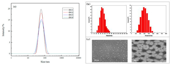 Figure 6a is a graph showing the copolymers’ particle size distribution measured by the dynamic light scattering instrument at room temperature. It can be seen from the figure that the particle size of the tBG1–tBG4 copolymers are centralized at 60–70 nm under the same conditions. At the same time, the micelle particle size distribution range expands slightly from tBG1 to tBG4, which is because the density of the graft chain P(MEO2MA-co-OEGMA) was increased. Theoretically, the more the P(MEO2MA-co-OEGMA) chains in the block-graft copolymer, the stronger the interaction of the hydrophilic groups at the shell portion of the micelles, so the micelle size should smaller too. The result of the graph is probably due to unevenness in the particle size of the micelles that is produced during the synthesis [40].