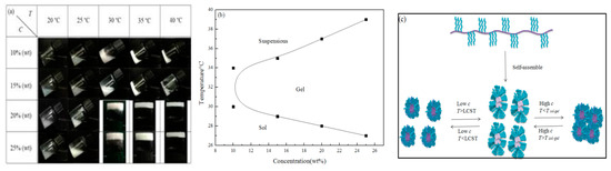 The sol–gel transition of the copolymer solution based on the cross-linking point, which was formed by the weak interaction between the outer branches of the micelle core; it is a physical cross-linking, so the sol–gel transition process is reversible, the copolymer aqueous solution can achieve a reversible transformation of the sol–gel depending on the temperature rise and fall [42], as shown in Figure 7c.