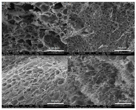 The morphology of the two dry gels was observed under a scanning electron microscope, as shown in the Figure 8. Both gels have the relatively obvious network structure. Figure 8a,b show the scanned photographs of the gel formed by the azide end-function mPEG-b-[PCL-g-(MEO2MA-co-OEGMA)]-b-mPEG copolymer and the alkyne-terminated P(MEO2MA-co-OEGMA) at 25 and 40 °C, respectively. Figure 8c,d show the scanned photographs of the gel formed by the azide end-functionalized copolymer mPEG-b-[PCL-g-(MEO2MA-co-OEGMA)]-b-mPEG with the TPOM at 25 and 40 °C, respectively. Comparing the gel pore sizes in Figure 8a–d, it was found that the pore size of the first gel was slightly smaller than the second one. This is because the observed porous structure of freeze-dried hydrogels were due to the phase separation of the gels during rapid freezing and subsequent removal of the water by sublimation which left voids in place where the water previously occupied, and the increased cross-link density results in the second gel faster phase separation during freezing [43]. Then, comparing the changes of the two gels between 25 °C with 40 °C, it can be seen that the gel was in a shrinking state at 40 °C, and the pore size of three-dimensional network become smaller. The reason for this is that the hydrophobic interactions of PCL–PEG chains at a higher temperature (T > LCST). The SEM images of the hydrogels at different temperature certified that two gels are temperature-sensitive [44].