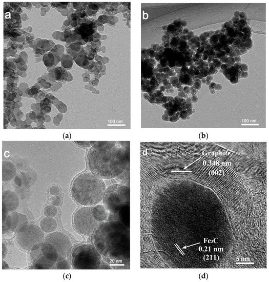 (a) Transmission electron microscope (TEM) image of polyacrylamide microspheres; (b,c) TEM and (d) high-resolution TEM (HRTEM) image of Fe3C@N/C-1.