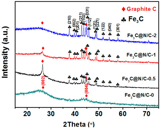 In order to further identify the crystal structure of samples, X-ray diffraction (XRD) patterns of these samples were recorded and shown in Figure 2. The major peaks located at 37.8°, 43.1°, 43.1°, 43.9°, 44.9°, 46.0°, 48.7° and 49.3° correspond to the Fe3C phase [35]. In addition, the peaks at 26.4° and 44.0° were assigned to the (002) and (004) reflection of graphitic carbon [26]. There are only broad graphitic carbon diffraction peaks in Fe3C@N/C-0 sample. With the introduction of ferroporphyrin, the graphitic carbon and Fe3C crystalline phases coexisted in the other samples. The relative intensity of Fe3C diffraction peaks increased with the iron content further enhanced in the synthesis process, indicating an increased ratio of Fe3C. The Fe3C nanocrystalline should originate from the reduction of iron precursor by carbon during the pyrolysis process. In the synthesis process of catalysts, ferroporphyrin was firstly dissolved in the KOH solution and homogeneously adsorbed in the polyacrylamide microspheres. Iron compound could be reduced by carbon to form metallic iron at high temperature, and these metallic iron atoms contribute to the catalytic graphitization of carbon [36]. When the iron atoms concentration is high enough, it would aggregate to form crystalline irons which react with the carbon atom to form a graphite layer-encapsulated Fe3C crystal during the process of pyrolysis and cooling. With the growth of Fe3C crystal, it is difficult for the large-size Fe3C crystal to make the inside carbon atoms diffuse onto the surface. Therefore, the relative intensity of graphitic carbon diffraction peaks weakens with the increase of iron content in the catalysts [35,36,37,38,39].