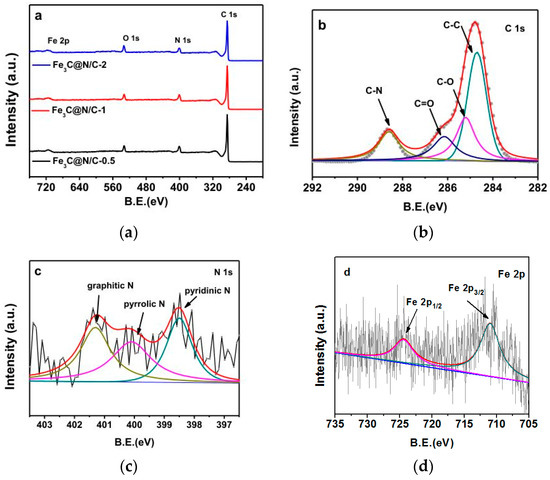 (a) X-ray photoelectron spectroscopy (XPS) survey spectra of Fe3C@N/C-x samples. (b) C 1s, (c) N 1s and (d) Fe 2p spectra of Fe3C@N/C-1.