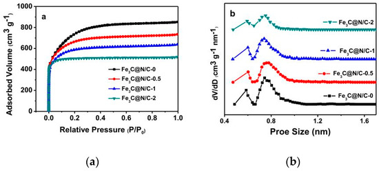 (a) Nitrogen adsorption and desorption curves. (b) pore size distribution of Fe3C@N/C-x samples.