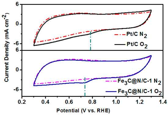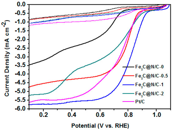 CV and LSV measurements were performed to study the electrochemical activity of these catalysts. Figure 5 shows the CV curves of Fe3C@N/C-1 catalyst and 20 wt % Pt/C in N2 and O2-saturated 0.1 M KOH solution. Well-defined oxygen reduction peak for Fe3C@N/C-1 catalyst and 20 wt % Pt/C could be seen in the CV curves when saturating the alkaline solution with O2, illustrating the pronounced ORR activity of Fe3C@N/C-1 catalyst. LSV curves were carried out on a rotating disk electrode (RDE) for the further evaluation of the electrocatalytic activity of catalyst samples for ORR. The LSV measurement was tested in O2-saturated 0.1M KOH solution at a rotation rate of 1600 rpm with a potential scan rate of 5 mV s−1 (the solid line). All samples were also tested in N2-saturated for comparison (the same colour scheme as the dotted line). As shown in Figure 6, the Fe3C@N/C-1 catalyst with onset potential of 0.94 V (vs. RHE) and diffusion-limiting current of 5.78 mA cm−2 reveals the remarkable catalytic performance towards ORR compared to the benchmark Pt/C (0.91 V and 5.55 mA cm−2 correspondingly). By contrast, the Fe3C@N/C-0 catalyst shows the lowest catalytic activity to ORR. It is reported that the encapsulated metal compound’s nanoparticles could produce host–guest electronic interaction and change the local work function of the carbon shell, creating additional active sites to ORR [33]. Doping of nitrogen into the carbon shell could further improve the catalytic activity of these core-shell structured catalysts by modifying the electronic properties of carbon surface. In addition, there is a general agreement that N-doped graphitic carbon is playing an important role in enhancing the conductivity of the catalysts which is essential for ORR. Therefore, the enhanced electrocatalytic performance of Fe3C@N/C-1 can be attributed to the synergistic effect between N-doped carbon and Fe3C as catalytic active sites. It should be noted that Fe3C@N/C-2 showed obviously lower electrocatalytic activity than that of Fe3C@N/C-1, due to the reduced specific surface area and depressed graphitization degree of the carbon shell in the Fe3C@N/C-2 catalyst. In Table 3 below, the performance of the Fe3C@N/C-1 catalyst is compared to some other Fe3C-based electrocatalysts reported in literature. Overall, the Fe3C@N/C-1 catalyst possessed comparative onset potential with other Fe3C based electrocatalysts. Moreover, the diffusion limiting current of the Fe3C@N/C-1 catalyst was higher than that of most catalysts, indicating the excellent electrochemical activity towards ORR.