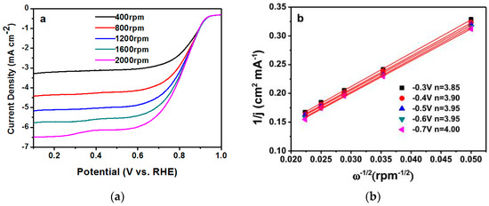 (a) LSV curves of Fe3C@N/C-1 catalyst with different rotating speed from 400 to 2000 rpm. (b) Koutecky–Levich (K–L) plots of Fe3C@N/C-1 catalyst calculated from Figure 7a.
