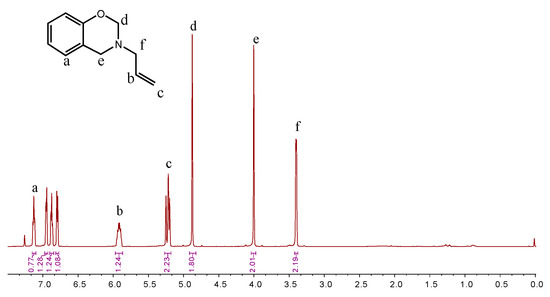 The synthesis route of BOZ is shown in Scheme 1 [1]. Paraformaldehyde (25.6 g, 0.8 mol) and allylamine (22.8 g, 0.4 mol) were stirred in toluene (60 mL) at room temperature for 30 min under a N2 atmosphere. Then, phenol (37.6 g, 0.4 mol) was added into the reaction system. The mixture was stirred at 80 °C for 2 h. Subsequently, the solution was cooled to room temperature, and washed using 1 mol/L NaOH solution and distilled water several times. Then, the organic layer was dried over anhydrous Na2SO4. The solution was dried under vacuum to afford a light-yellow liquid. Yield: 56 g, 80%; 1H NMR (600 MHz, CDCl3, 298 K): δ 6.80–7.13 (s, 4H, Ar–H), 5.92 (tt, 1H, C–CH=C), 5.27–5.18 (m, 2H, =CH2), 4.88 (s, 2H, O–CH2–N), 4.00 (s, 2H, Ar–O–N), 3.40 (d, 2H, N–CH2–C). FTIR (cm−1): 3077 cm−1 (stretching of =C–H), 1843–1560 cm−1 (skeleton vibration of benzene ring), 1646 cm−1 (stretching of C=C), 914 cm−1 (symmetric stretching of C-O-C), 746 cm−1 (out-of-plane bending vibrations of olefinic =C–H). HRMS (MALDI-TOF): m/z 175 [M+, calcd 175].