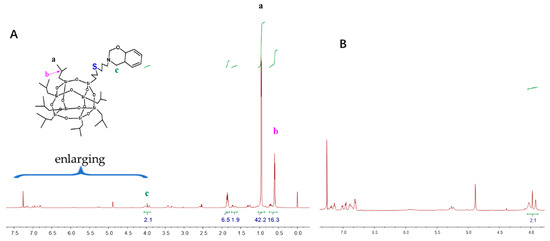 The monofunctional POSS derivative is the most useful compound for copolymerization with other monomers through diverse functional groups, and a mono-functionalized BOZ ring containing POSS (BOZ-POSS) has been prepared using different methods [32,33]. However, we synthesized SPOSS-BOZ using the thiol-ene (click) reaction, which is an effective method with almost no side reactions [34]. SPOSS and P-ala were dissolved in tetrahydrofuran (THF) and this solution was irradiated only for 5 min under UV light to prepare the mono-functionalized BOZ ring containing POSS. It can be seen from the FTIR spectrum in Figure 4 that the S–H peak at 2700 cm−1 disappeared after SPOSS was modified by benzoxazine. The chemical structure of SPOSS-BOZ was confirmed by 1H NMR (Figure 5). The resonance peaks at 6.8–7.2 ppm were assigned to the aromatic protons. The characteristic protons of the oxazine ring appeared at 4.8 ppm and 3.96 ppm (Peak c) and were assigned to –O–CH2–N– and –Ar– CH2–N–, respectively. The resonance peaks at 0.68 ppm (Peak b), 0.93 ppm (Peak a), and 1.88 ppm were caused by the seven isobutyl hydrocarbon substituents of the POSS. Next, we magnified the spectra of the allyl moiety (Figure 5B). Furthermore, the resonances of –CH*=C and = protons that appeared at 5.9 ppm and 5.2–5.25 ppm almost disappeared, respectively. Therefore, POSS was successfully incorporated into benzoxazine.