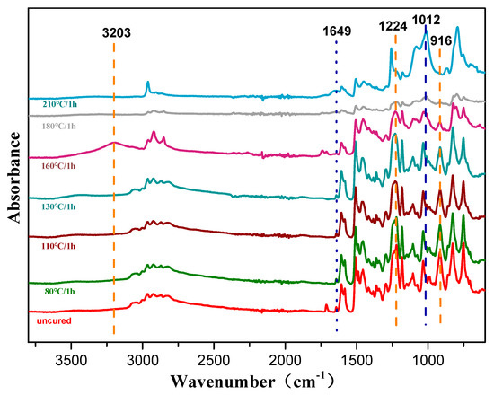 The thermally activated polymerization reaction of the copolymers was also studied by non-isothermal DSC, as shown in Figure S1, Supplementary Materials. The oxazine ring opening highly overlapped the allyl addition polymerization exotherm at the temperature range of 170–250 °C. To eliminate this effect, the extrapolation method was used to determine the peak temperature when the heating rate β was 0, and the curing temperature range was determined. The DSC data is shown in Table 1. It can be seen from Figure 6 that when β was 0, Ti, Tp, and Tf were 144 °C, 210 °C, and 240 °C, respectively, and the resin system started to react in the range of 144 to 210 °C. Combined with the relevant data [35], the curing process of the resin system was determined to be 80/1 h + 110/1 h + 130/1 h + 160/1 h + 180/1 h + 210/1 h. Furthermore, the step-wise curing process of the composites was studied by FTIR spectroscopy as shown in Figure 7. As the curing temperature increased, the bands at 1649 cm−1 and 916 cm−1 decreased due to the allyl and the characteristic peaks of the oxazine ring respectively, which indicated that the ring-opening reaction and polymerization of the oxazine ring had taken place. Meanwhile, the peak at 3203 cm−1 was due to the phenolic hydroxyl group that occurred at 160 °C/1 h. With curing proceeding, the peak at 1224 cm−1 vanished because the epoxy group decreased, whereas the peak at 1012 cm−1 increased due to the ether bond. The reaction between the phenolic hydroxyl group and epoxy group was found. Therefore, these results proved that the copolymer had been completely polymerized [9].