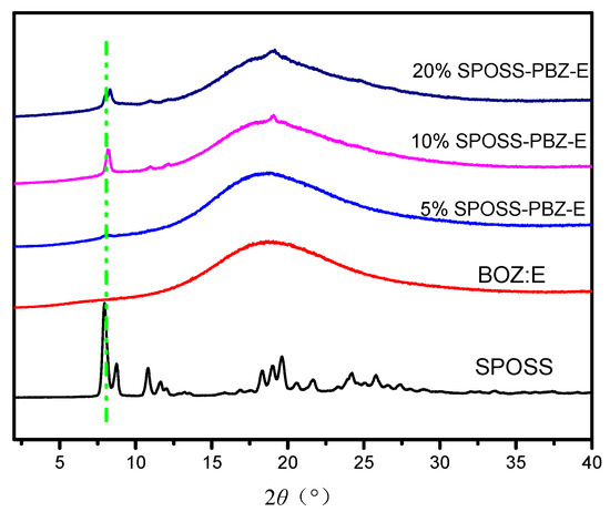 Figure 8 displays the X-ray diffraction patterns for the SPOSS and SPOSS-PBZ-E nanocomposites. The sharp diffraction peaks seen for the SPOSS indicated a highly crystal structure consistent with the literature [36,37,38,39,40]. As can be seen in Figure 8, the XRD pattern for BOZ:E itself showed one broad peak at 2θ ≈ 20°, which confirmed its amorphous structure. After the incorporation of SPOSS nanoparticles into the BOZ:E matrix, the peaks observed in the pure POSS nanoparticle completely disappeared in the case of the 5 wt % SPOSS-PBZ-E, suggesting the molecular dispersion of the SPOSS nanoparticles in the SPOSS-PBZ-E nanocomposite, and also displayed a broad peak at 2θ ≈ 20°. This indicated that SPOSS was chemically incorporated into the hybrid nanocomposite and formed a cross-linked network between the SPOSS and BOZ:E blend. However, a crystalline peak at 2θ = 7.97°, corresponding to the strong diffraction of the SPOSS monomer, was observed when the content of SPOSS was more than 10 wt %. Hence, this indicates that separate POSS domains were present in the SPOSS-PBZ-E nanocomposites.