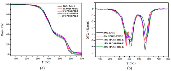 (a) TG and (b) DTG curves of the SPOSS-PBZ-E nanocomposites under N2 atmosphere.