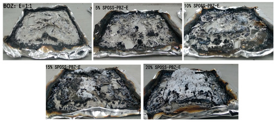 The HRR versus time curves for the SPOSS-BOZ-E nanocomposites are presented in Figure 12. It can be seen that all the composites burned rapidly, and the typical char-forming platform was not observed. For the neat benzoxazine/epoxy resin, the pHRR was 1156 kW/m2, and the pHRR values of the 5% SPOSS-PBZ-E, 10% SPOSS-PBZ-E, 15% SPOSS-PBZ-E, and 20% SPOSS-PBZ-E were 957, 962, 942, and 769 kW/m2, respectively. It is clear that SPOSS-BOZ apparently hinders the decomposition of the composites and improves the flame retardancy. The addition of 20 wt % SPOSS-BOZ caused reductions in the pHRR, aHRR, and THR values by about 33%, 27%, and 25%, respectively (Table 5). The reductions of these data resulted from the effect of the formation of a char barrier (Figure 13). During the cone calorimeter test, the organic group of POSS nanoparticles degrades and leaves the Si–O–Si-based ceramic layer [37,38]. As shown in Figure 13, when the content of SPOSS-BOZ increased, the residual carbon content of the benzoxazine/epoxy resin increased slightly, and when the content of SPOSS-BOZ reached 20 wt %, a thicker, continuous, and intumescent insulation layer with an integral structure was formed during combustion. However, the TSR of samples increased in the 15%SPOSS-PBZ-E and 20%SPOSS-PBZ-E samples with enlarging POSS content.