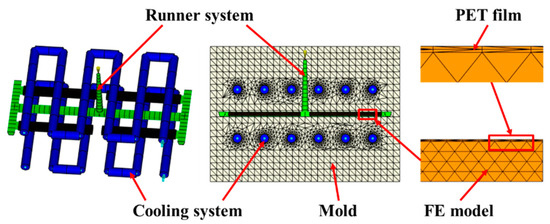 To correspond to the experiment, a 4-cavity was used, and the flexural sample (80 × 10 × 4 mm) was selected as the research object. The decorative film (PET) with the thickness of 0.2 mm was attached to the mold cavity surface, and the cooling system and runner system were established as required in Moldflow as shown in Figure 2. The main processing parameters were set as follows: melt temperature 220 °C, mold temperature 50 °C, coolant temperature 25 °C, foaming agent’s content 0.5%; the bubble nucleation model used the fitted classical nucleation model due to the asymmetric mold cavity temperature distribution which affects bubble nucleation.