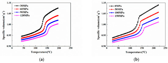 A PVT testing machine (PVT-6000, Gotech, Beijing, China) was used to measure the PVT performance; the method adopted was the isostatic cooling method, the pressure was set to 30, 60, 90 and 120 MPa, the temperature was heated to 200 °C, and the cooling rate was 5 °C/min.