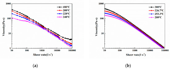 Viscosity was measured using the capillary rheometer (CR-6000, Gotech, Beijing, China); the experimental method used was to keep the temperature constant, pressurize, and then viscosity was measured at different shear rates, and the experiment was repeated at different temperatures (180, 200, 220 and 240 °C).