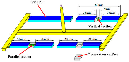 Three flexural samples on the same cavity were selected as the observation object, as shown in Figure 5. The vertical section (10 × 4 mm), which represents the cross-section of the sample perpendicular to the melt flow direction, was observed to assess the cell structure and distribution. The parallel section (10 × 4 mm), which represents the cross-section of the sample parallel to the melt flow direction, was examined to obtain the orientation and deformation of the cells. The cell diameter and cell number were measured by Image Pro Plus 6.0 based on SEM micrographs. The cell average radius (R) was calculated using Equation (1):