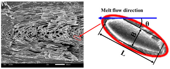 where L represents the major axis length of the cell, and B represents the minor axis length of the cell. The tilt angle (θ) was defined as the angle between the major axis of the cell and the melt flow direction (sharp angle), which is shown in Figure 6 [27].
