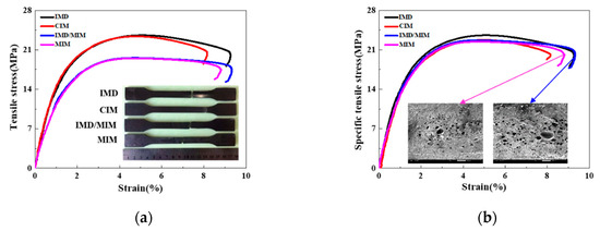 The tensile properties of the IMD, CIM, IMD/MIM and MIM samples: (a) tensile stress-strain curves; (b) specific tensile stress-strain curves.