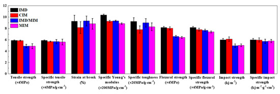 Comparison of mechanical properties among the IMD, CIM, IMD/MIM and MIM samples (the error bars in the figure represent the standard deviation).