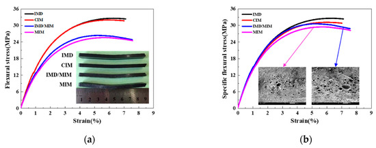 The flexural properties of the IMD, CIM, IMD/MIM and MIM samples: (a) flexural stress-strain curves; (b) specific flexural stress-strain curves.