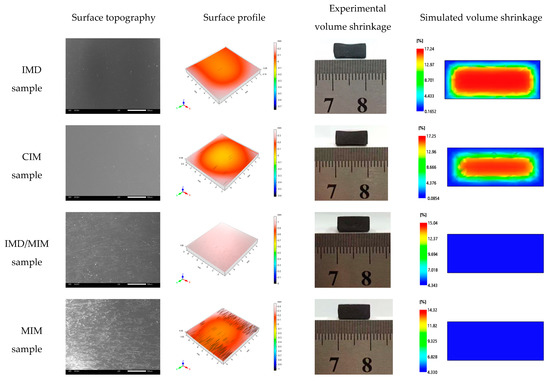 The comparison of the surface topography, surface profile, experimental volume shrinkage and simulated volume shrinkage among the IMD, CIM, IMD/MIM and MIM samples.