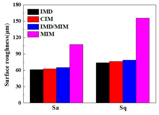 The comparison of the surface roughness indexes among the IMD, CIM, IMD/MIM and MIM samples.
