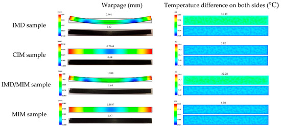 The comparison of the warpage and temperature difference on both sides among the IMD, CIM, IMD/MIM and MIM samples.