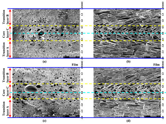 From Figure 14c,d, we can see that the largest cell of the MIM sample is on the center line, while the largest cell of the IMD/MIM sample is offset from the center line toward the film side. Due to the presence of the film, the temperature on the film side is higher than that on the non-film side. The maximum temperature no longer appears on the center line of the sample thickness, but is shifted to a certain distance toward the film side, so the largest cell of the IMD/MIM is biased toward the film side. The distance from the left edge of the MIM core layer to the left surface is 1.41 mm, and the distance from the right edge to the right surface is 1.39 mm, while the distance from the left edge of the IMD/MIM core layer to the left surface is approximately 1.49 mm and the distance from the right edge to the right surface is approximately 1.31 mm. It can be clearly seen that the core layer of the MIM is symmetrical about the center line, while the core layer of the IMD/MIM is offset by 0.08 mm toward the film side.