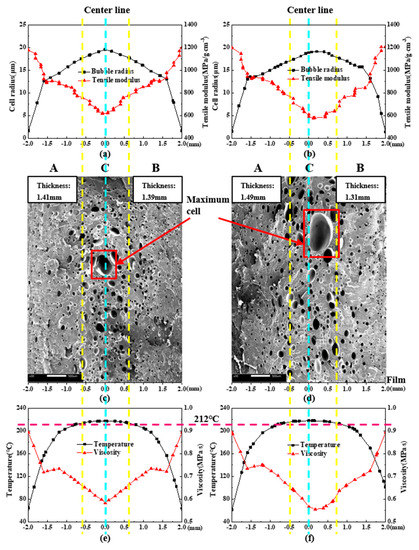 The simulation results and SEM micrographs of the vertical section of MIM and IMD/MIM samples are given in Figure 14. It can be seen that whether it is the MIM or IMD/MIM sample, the cell size of the core layer is larger than that of the transition layer, which is consistent with the cell size distribution in Figure 14a,b. Combined with the temperature curves in Figure 14e,f, it can be found that the temperature distribution along the thickness direction of the sample is not uniform, and the temperature of the core layer is higher than that of the transition layer, which provides a longer time for cell growth. Therefore, there is such a phenomenon that the core layer has large cells and the transition layer cells are small. As can be seen from Figure 14a,b, the cell radius and tensile modulus change in the opposite direction in the thickness direction, and the maximum cell radius corresponds to the minimum tensile modulus, which illustrates that the cell size affects the tensile modulus. The cell density of the core layer is less than that of the transition layer. In combination with the viscosity curves of Figure 14e,f, higher temperature of core layer provides longer growth times for cells, while lower viscosity results in lower melt strength, thus reducing cell growth resistance. Therefore, the cells are merged and collapsed more, resulting in the cell density of the core layer being lower than that of the transition layer.