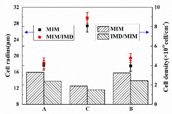The cell radius and cell density of the transition layer A, core layer C and transition layer B of MIM and IMD/MIM samples.