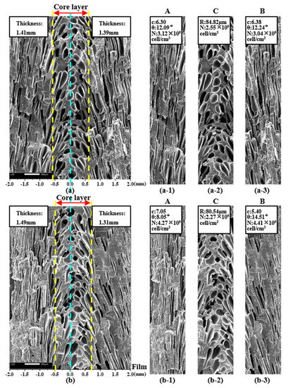 Since the cells in the vertical section are hardly deformed, we can divide the vertical section of the MIM and IMD/MIM samples into three layers, namely, the transition layer A, transition layer B and core layer C based on the cell size distribution, as shown in Figure 13. For the cells in the parallel section, they are stretched and compressed under the action of the shear flow, resulting in deformation. We no longer stratify according to the cell size distribution, but determine the boundary between the transition layer and the core layer according to the degree of cell deformation.