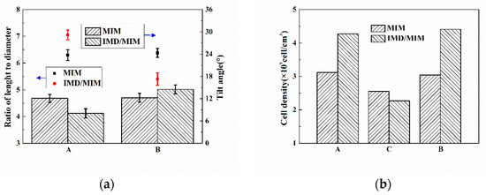 (a) The ratio of length to diameter and tilt angle of the transition layer A and transition layer B of MIM and IMD/MIM samples; (b) The cell density of the transition layer A, core layer C and transition layer B of MIM and IMD/MIM samples.