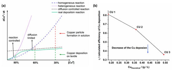 At high OH−, Cu2+, Tartrate and CH2O concentrations in solution, the heterogeneous copper deposition rate on CLY surface (A) competes with the homogeneous copper reaction rate in solution (Figure 1b). The diffusion of Cu2+ ions to the textile surface (a) limits the copper deposition rate. Thus, the formation of copper residue occurs in solution simultaneously to the copper deposition on the textile surface (A) and the overall copper deposition rate is large.