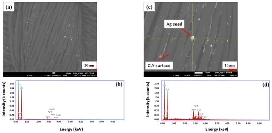 The silver content in Table 2 is too high to be related only to silver seed of 8 µm size (Figure 3c) and Figure 4c shows silver seeds smaller than 8 µm. The silver seeds had different sizes and were randomly distributed on the CLY surface. In Table 2, the content of silver [Ag] is lower in comparison to the copper content. Thus, silver seeded CLY fabrics indicated a high resistance in GΩ (Giga Ohm) range, which drops to 1.89 Ωsq−1 and 5.24 Ωsq−1 after the ECD. The copper-coated CLY fabrics reveal a conductive property due to the copper coating.