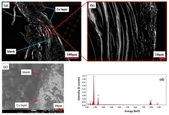Table 3 is related to the EDX spectra in Figure 6a,d, which shows the elemental distribution of Cu, O, C and Ag from the copper-coated cellulose surface (CU 1). It indicates that the Cu element has the highest weight proportion of 81.36% compared to the O element of 9.46%, C element of 7.4% and Ag element of 1.77% on the copper-coated cellulose sample.