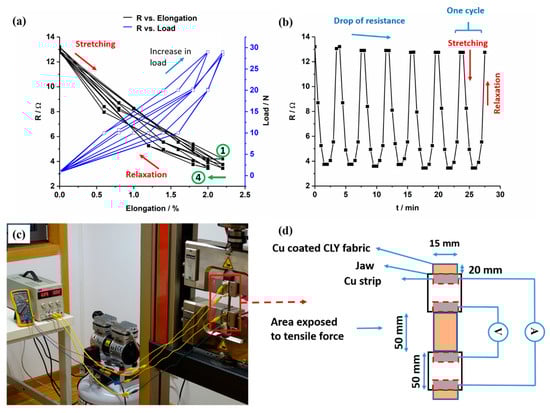 In Figure 10, the resistance (R) of the copper-coated CLY fabric changed as a function of cyclic elongation. The copper-coated CLY fabric was elongated and relaxed in a cycle, which was fixed between two jaws with an isolating rubber layer. The resistance change during elongation of Cu-coated CLY strip of 28.5 cm2 was investigated with the four point method. During cyclic elongation, current was applied by the two outer Cu strips while measuring the voltage with two inner Cu strips (Figure 10c,d).