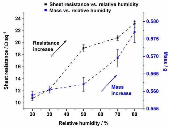 Change of sheet resistance (from 10.8 Ωsq−1 to 23 Ωsq−1) and mass change (from 0.55 g to 0.58 g) of the Cu-coated CLY (CU 1) fabric as a function of relative humidity.