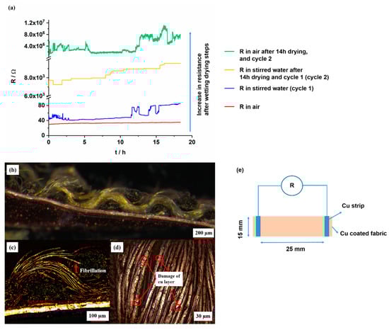 Resistance change of Cu-coated CLY (CU 1) fabrics (d = 15 mm, l = 25 mm) measured in air (red and green curves) and during stirring in water at 25 °C at a stirring speed of 750 rpm (blue and orange curves) (a). The figure shows a connection between Cu-coated CLY and Cu foil (b), the fibrillation of Cu-coated CLY fibers (c), the damaged copper coating (d) and the measuring procedure (e).
