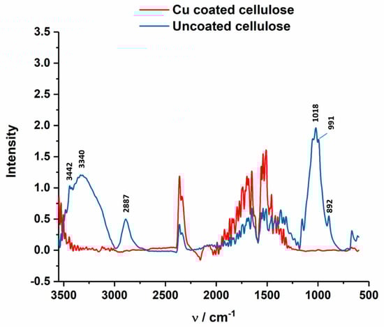In Figure 13, ATR-FTIR spectrum of uncoated and Cu-coated cellulose is shown, which confirms the chemical changes of the Cu coating at the textile surface. The Cu-coated sample does not indicated characteristic cellulose peaks at 3442 cm−1 (O(2)H O(6) intramolecular hydrogen bond), 3340 cm−1 (O(3)H O(5) intramolecular hydrogen bond), 2887 cm−1 (C–H stretch), 1018 cm−1 (C–O vibration at C(3) O(3)H), 991 cm−1 (C–O valence vibration at C(6)) and 892 cm−1 (C–O–C valence vibration) [48].
