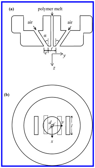 The measurement of air velocity direction in this study was performed on the single-orifice slot-die melt-blown device (if the multifibers, shown in Figure 1a, are changed to be single fiber, then the single-orifice slot-die melt-blown process is shown). The structure of the slot die used in this work is shown in Figure 3. Slot die is referred to as a blunt-edge with a nose-piece width (f) of 1.28 mm, a slot angle (α) of 30°, and a slot width (e) of 0.65 mm, the orifice diameter for the polymer melt (d) was 0.42 mm. Other details of this slot die can be found in the manuscript of Xie [15], this kind of die was also described by other researchers [3,10]. The coordinate system used is also shown in Figure 3, all coordinates are relative to the die face. Its origin is at the center of the die face, the x direction is along the major axis of the nose piece and slots, whereas the y direction is transverse to the major axis of the nose piece and slots. The z direction is directed vertically downward.