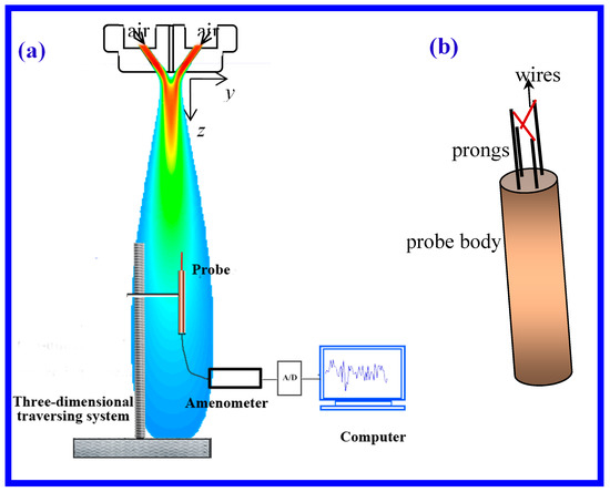 The CTA signal was acquired via an A/D converter board and saved as a data series in a computer. Series of air velocities were obtained by converting the data series of voltages via Equation (7). Actually, the so-called air velocity refers to the mean of the data series of velocities. As a core component of the CTA, probes are available in one-, two-, and three-dimensional versions as single-, dual-, and triple-wire probes referring to the number of wires. Since the wires respond to both magnitude and direction of the velocity vector, information about both can be obtained, only when two or more wires are placed under different angles to the flow vector. A dual-wire probe was attempted for the velocity-direction measurement in this work, Figure 4b illustrates the structure of the dual-wire probe used in this measurement, the dual-wire probe consisted of two systems of single-wire probes, each probe had a wire with a 5 μm diameter and a 1.6 mm length spot-welded to needle-shaped prongs, made of stainless steel. The two planes which contain the two wires and their corresponding prongs were parallel to each other, the projections on the parallel planes of the two wires were vertical. Note that the arrangement of the two wires was very important during measurement, for example, the plane which contains the two wires and its corresponding prongs is in the x–z plane, with this arrangement, the angle between the projection of the air velocity in the x–z plane and the z-axis is measured. In the present work, the projection of the air velocity in the x–z plane was called velocity in x–z plane for short.
