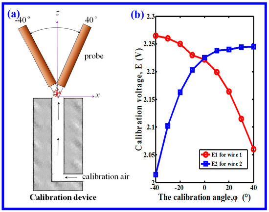 Calibration is an indispensable process before all formal measurements, similarly, before the air velocity direction measurement, the directional calibration was accomplished on a calibration device at ambient temperature. Calibration establishes a relationship between the CTA output and the air direction. As shown in Figure 5a, it was performed by exposing the probe to a known air velocity from different angles, two responding voltages (E1 and E2) could be obtained for the dual wires. By the principle of Equation (7), E1 and E2 were different, because of the angle of arrangement of the dual wires. Figure 5b shows the calibration angle and its two responding voltages for the dual wires, which is called the directional-calibration curve, the calibration angle, φ, was set from −40° to 40° with an interval of 10°. Here, the calibration angle and the ratio of E1 and E2 had a relationship of